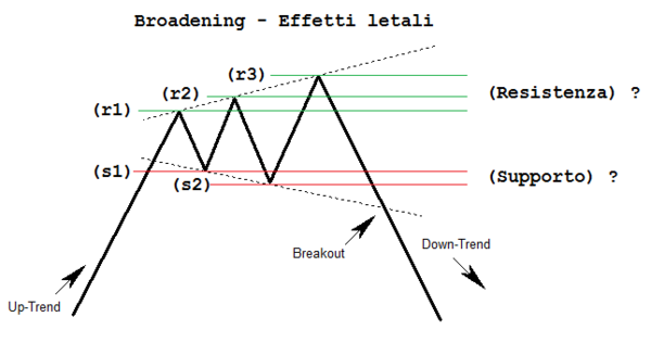 Broadening, che significa “ampliamento” è il calzante nome che viene dato a una formazione grafica che si espande, facendo massimi superiori e minimi inferiori, quasi a formare un megafono stilizzato.