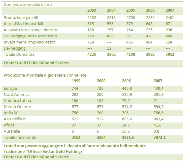 Nei primi anni ’80 la domanda era concentrata per ¾ nei paesi sviluppati, viceversa negli anni ’90 nei paesi emergenti. La produzione è passata dalle 1.200 tonnellate circa degli anni ’70 e primi ’80 alle 2.800 dell’inizio degli anni ’90 fino alle circa 3.150 del 1999. L’aumento della fabbricazione degli anni ’90 è dovuto soprattutto all’incremento nella produzione di oggetti tradizionali indossati per speciali occasioni di vita sociale e per i matrimoni in India, dove grazie, anche alla liberalizzazione legislativa del settore, è divenuto il maggior consumatore di oreficeria. Cina, India ed Indonesia rappresentano paesi con maggiore potenzialità di sviluppo futuro in considerazione anche del fatto che qui vive metà della popolazione mondiale.
