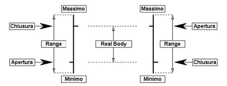 Alla sinistra una tacca segna il prezzo di apertura mentre a destra segna quello di chiusura.