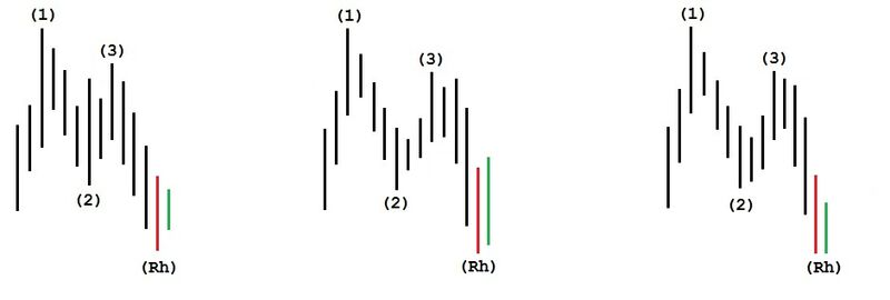 L'uncino di Ross è evidenziato con il colore rosso e la scritta (Rh), la barra di colore verde è quella che consente di individuare l'uncino di Ross. Nel primo caso la barra che genere l'uncino di Ross non ha ne un massimo superiore ne un minimo inferiore, è la classica barra inside che interrompe momentaneamente il trend. Nel secondo caso la reazione è più forte, non vi è un minimo inferiore ma si è in presenza anche di un massimo superiore al precedente. Nel terzo caso la barra che identifica l'uncino di Ross ha il minimo allo stesso livello della barra uncino.