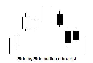 Side-by-Side è composto da due candele dello stesso colore e di dimensione simile. Fornisce indicazione di continuazione del trend quando si forma un gap tra le due candele del side-by-side e la candela precedente. Nel caso bearish il gap si avrà con la candela nera, nel caso bullish con la candela bianca. L'apertura delle due candles deve essere allo stesso livello e non è indispensabile che la chiusura delle due candele sia coincidente.